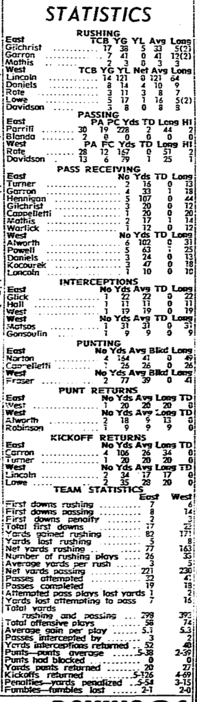 The AFL All-Star game for the 1963 season was held on January 19th at Balboa Stadium in San Diego. This was two weeks after the Chargers won the AFL Championship over the Boston Patriots. The Western division won the game, 27-24, in front of 20,016 fans. This was the final AFL all-star game played in San Diego; in future years, the game was played in Houston, Oakland, and Jacksonville.