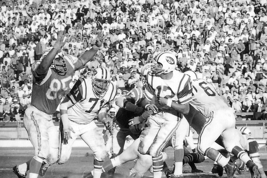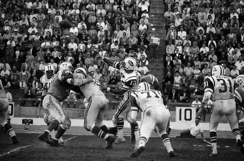 First, a slideshow of the 1965 game, won by the San Diego. The Chargers picked off three of Namath’s passes.